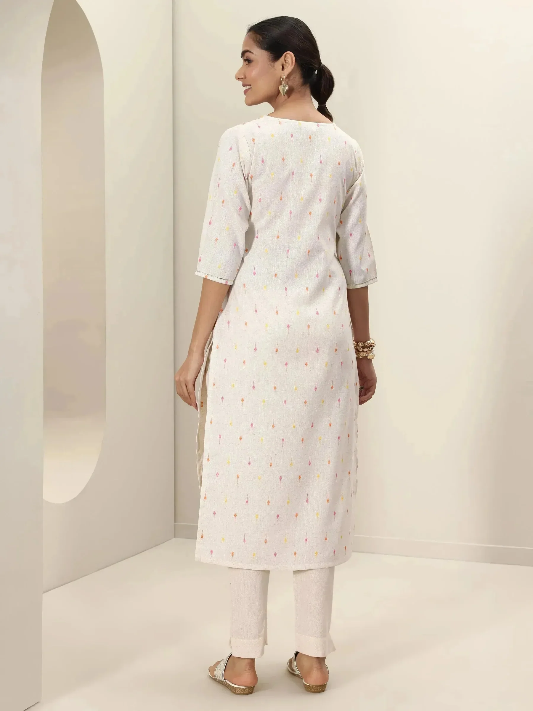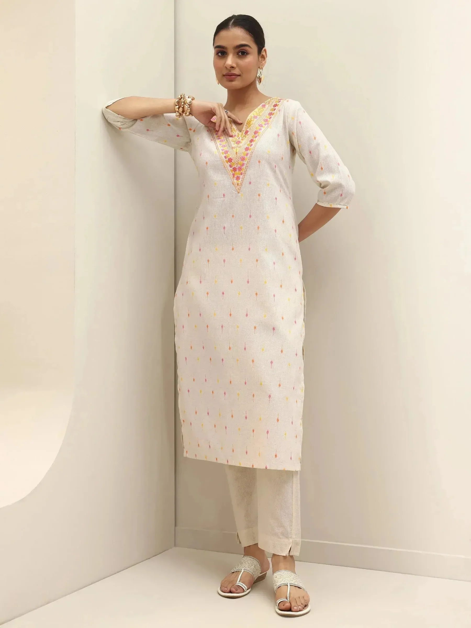 Off White Embroidered Cotton Straight Kurta